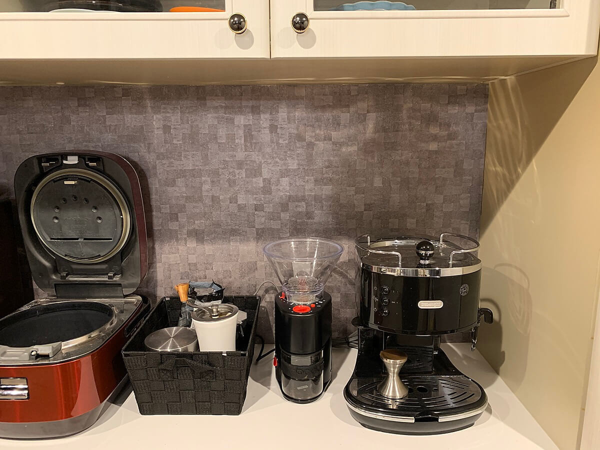 我が家では、片側に大き目のコーヒーカップ2個とコーヒードリッパーを、もう一方には子ども用のおしゃれなカップ2個を収納しています。