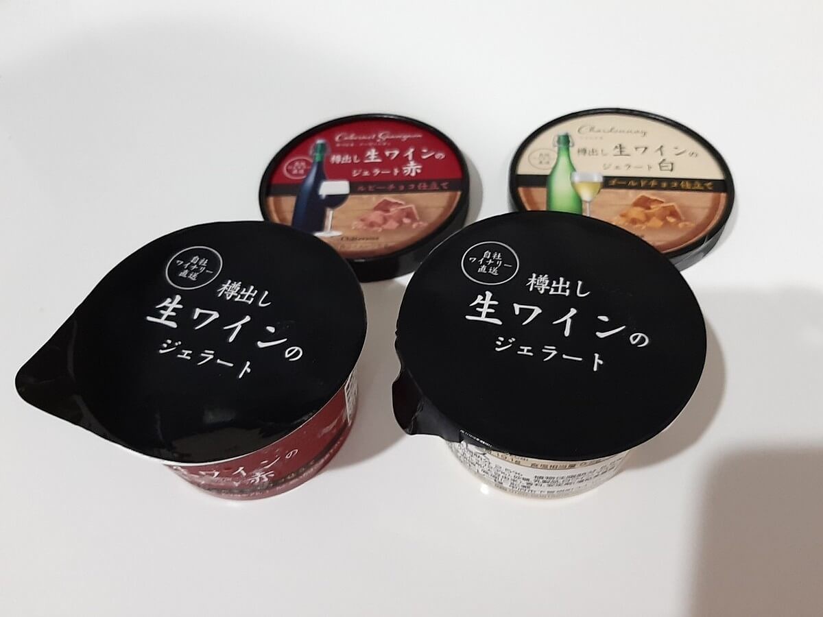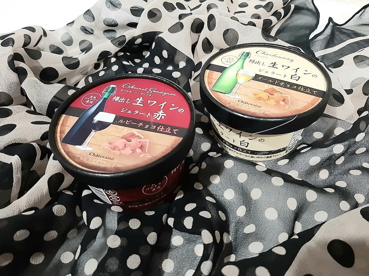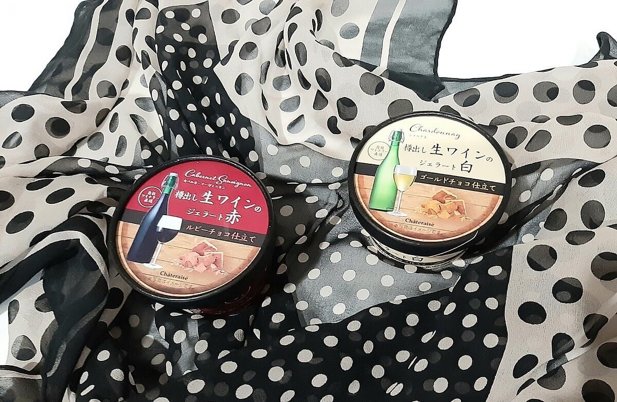 シャトレーゼの自社ワイナリー直送の生ワインを使用したジェラート。パッケージから大人っぽい雰囲気になっています。 赤ワインと白ワインの2種類展開で、それぞれ使っているチョコレートも違うこだわりの一品です。
