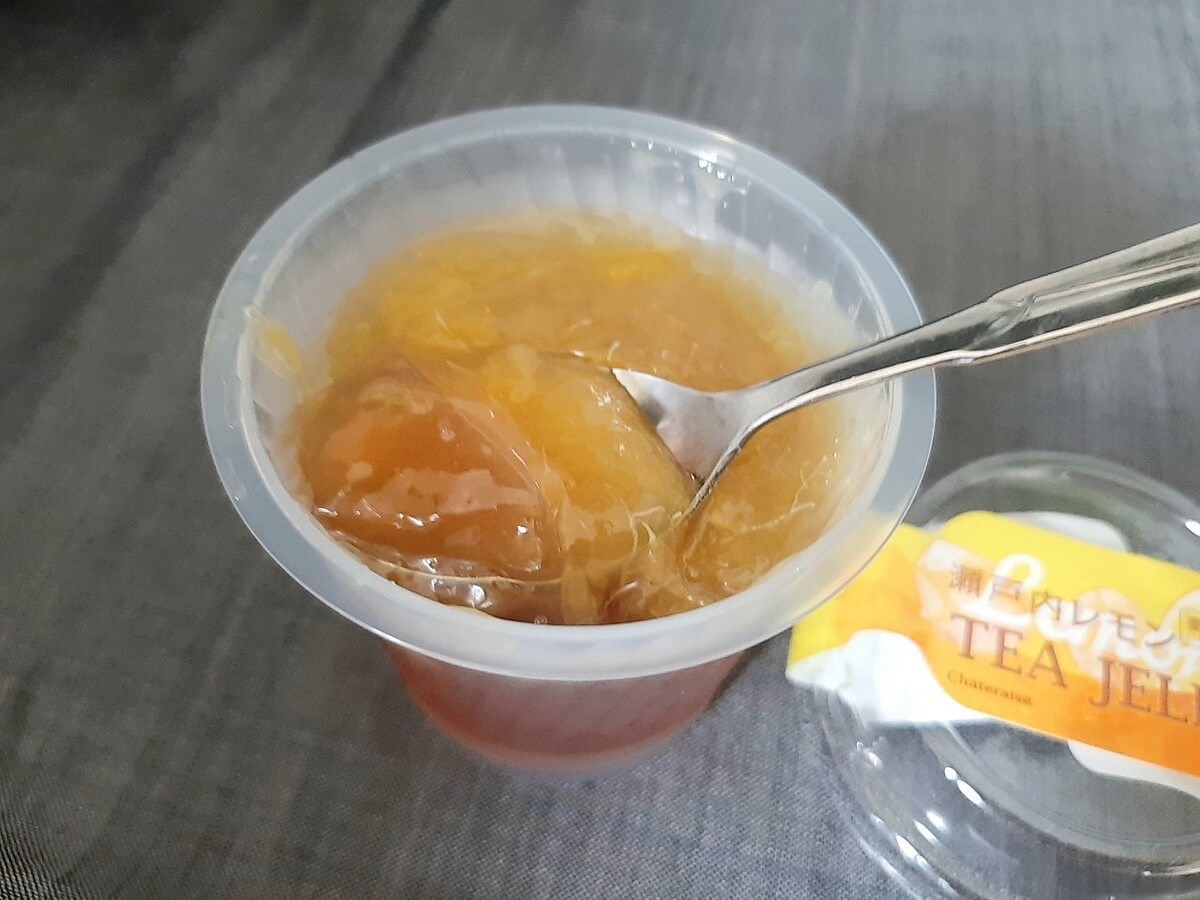 こちらは、5月22日に発売されたレモンティーゼリーです。 下の層が紅茶のゼリー、上がレモン汁とオレンジ果肉のコンポートになっています。