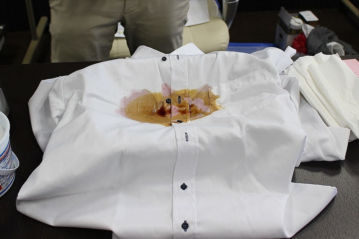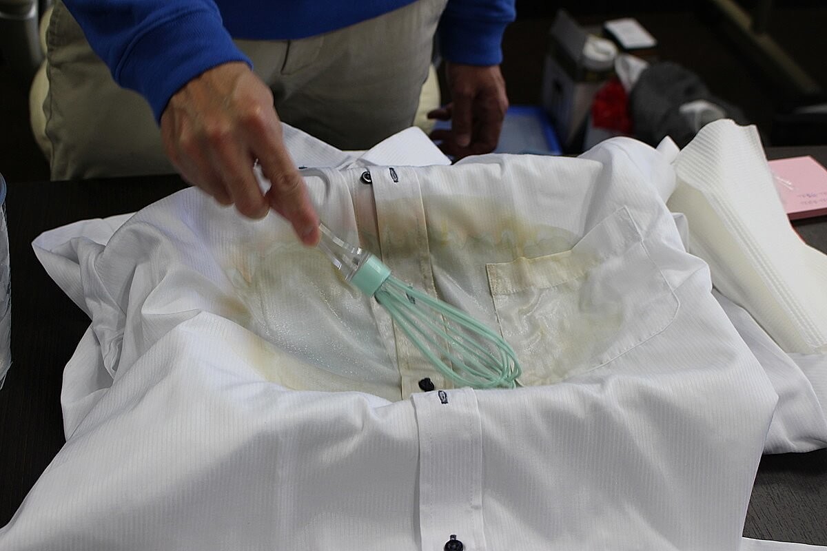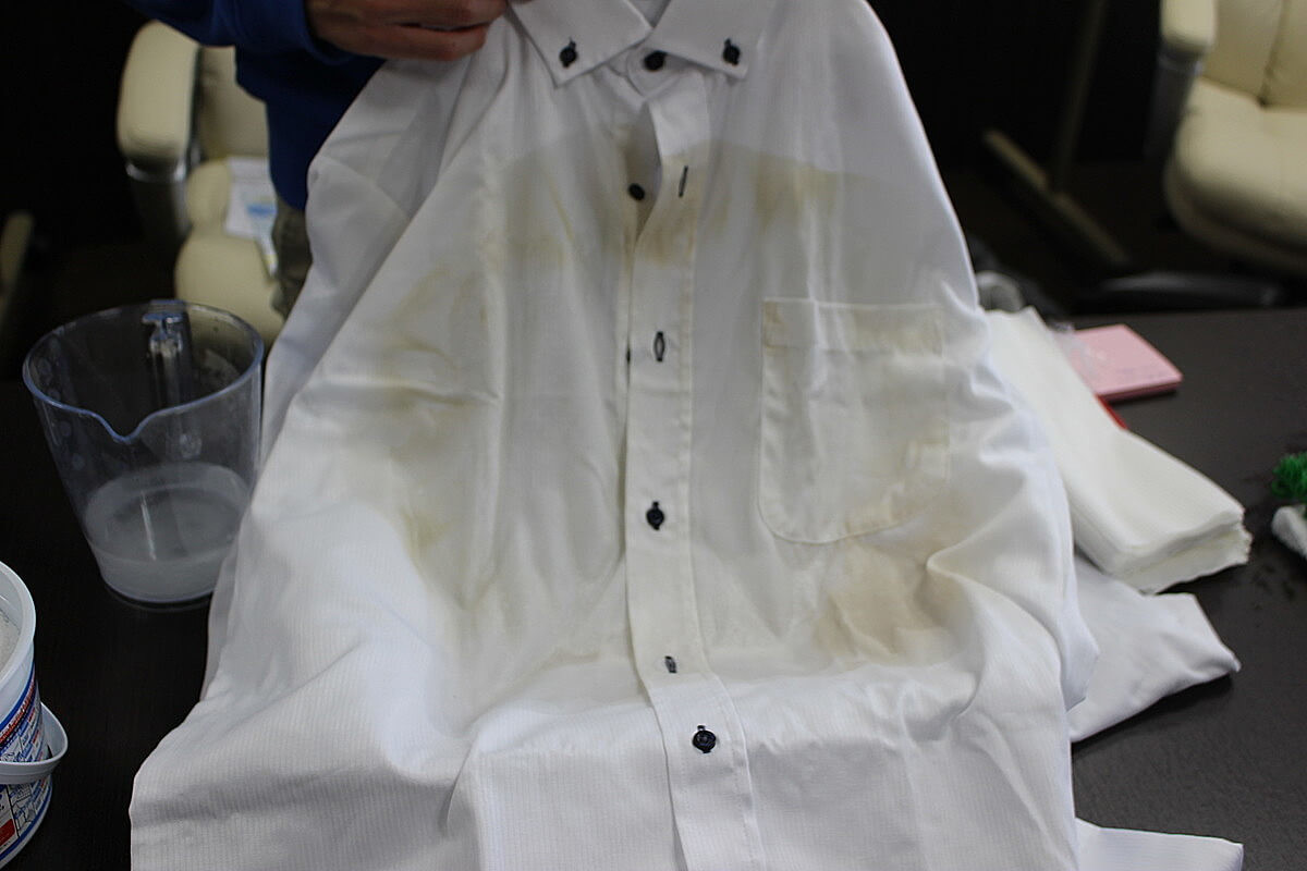 今回は田邊さん自ら、真っ白なワイシャツを赤ワインとお醤油で汚して、オキシクリーンで落としてくれます。