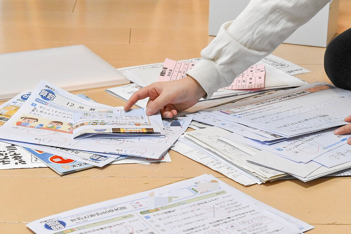 長期休みに入ったら、クリアファイルに溜まったプリント類を子どもが整理します。