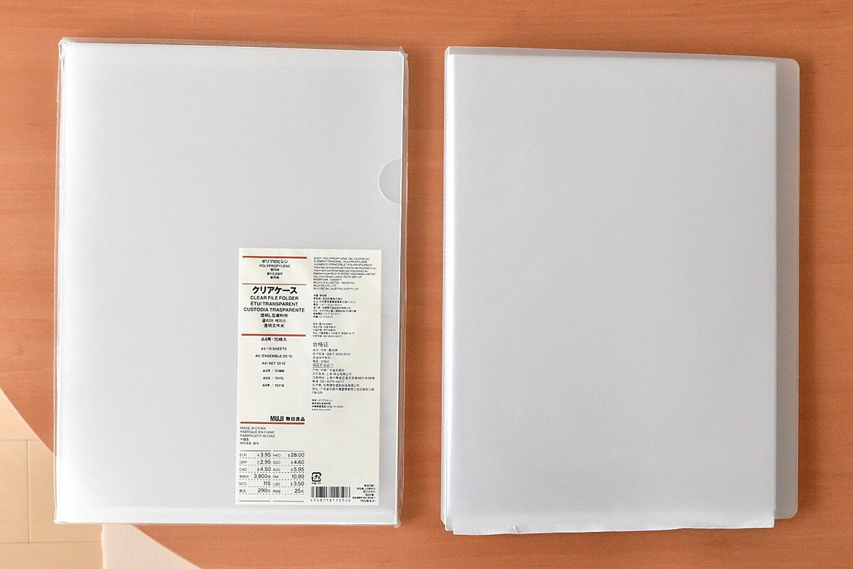毎日のプリントをとりあえず入れているのが、ポリプロピレンクリアケースA4用・10枚入り税込290円(左)です。