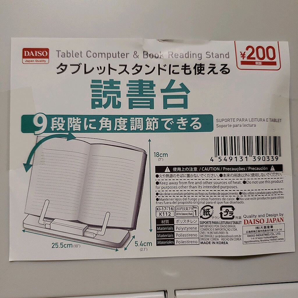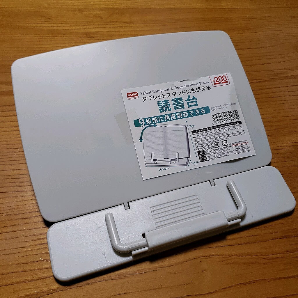 レシピ本を寝かせて広げておくスペースがない場合は、読書台もオススメです。こちらはダイソーで200円(税抜)です。