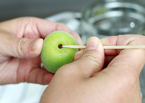 梅の水気を布巾などで綺麗にふきとり、ヘタを竹串でひとつひとつ丁寧にとっていきます。