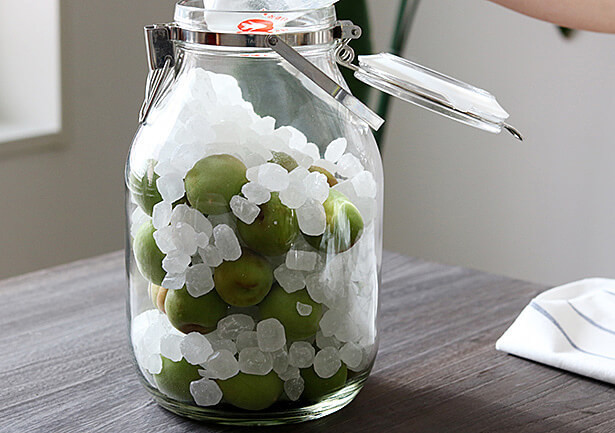 保存瓶に梅と氷砂糖を交互に入れていきます。