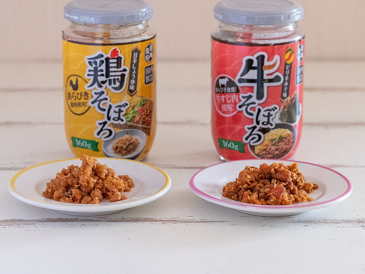 業務スーパーで販売されている瓶詰め商品「鶏そぼろ」と「牛そぼろ」。