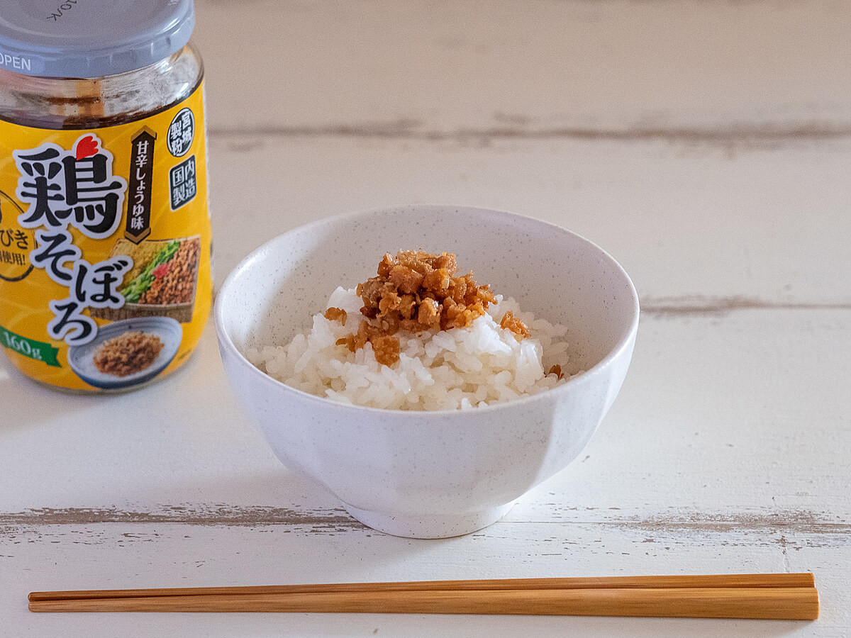「鶏そぼろ」をごはんにのせて、ひとくちパクッといただいてみました。