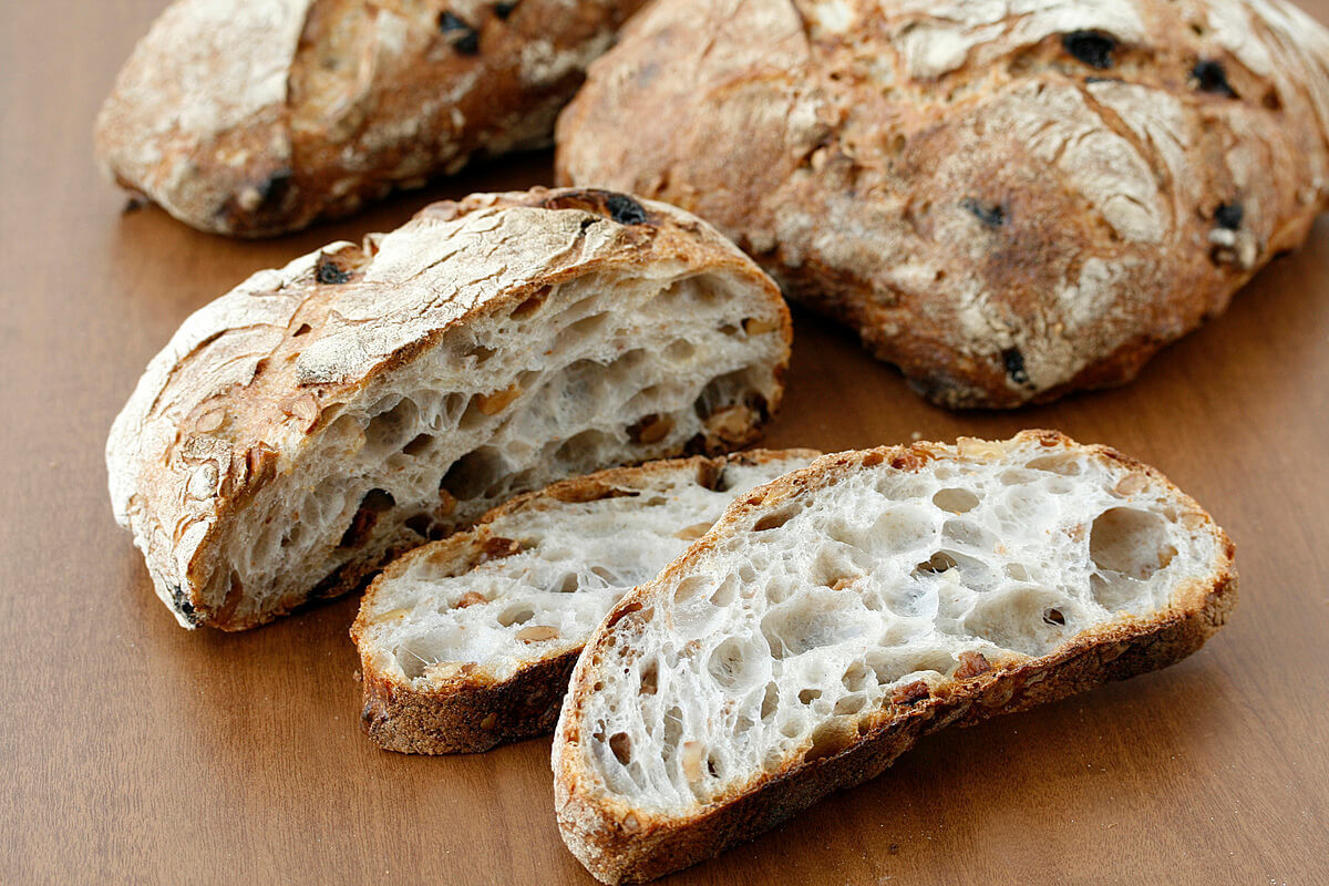 もちもちとした食感と蜂の巣のような内層が特徴の、フランス・ロデヴ地方のパンにドライフルーツを入れました。