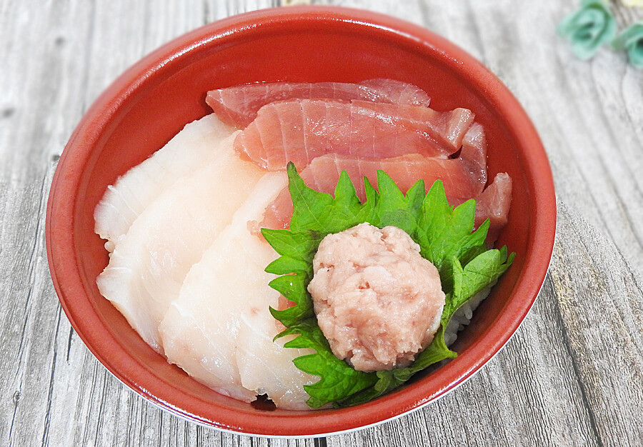 はま寿司「寿司屋のまぐろ丼」の上には、まぐろ・とろびんちょう・ねぎとろの3種類のまぐろがトッピングされています。