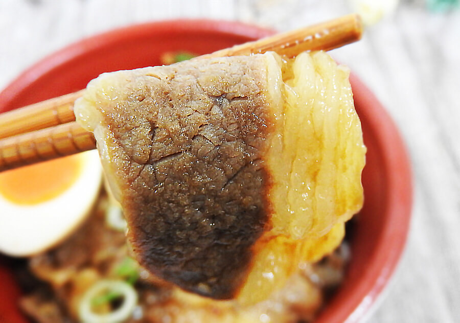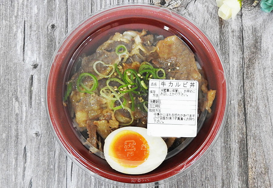 直火焼きの牛カルビと半熟ゆで卵がのっています。
