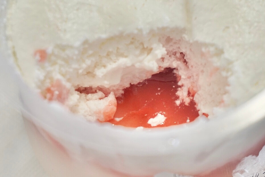 スプーンで食べる、いちごみるく味のわらび餅です。