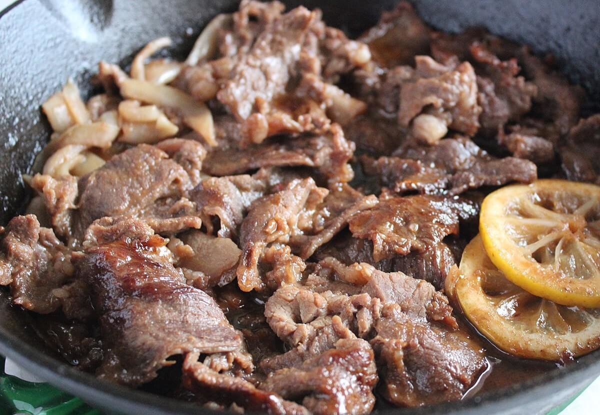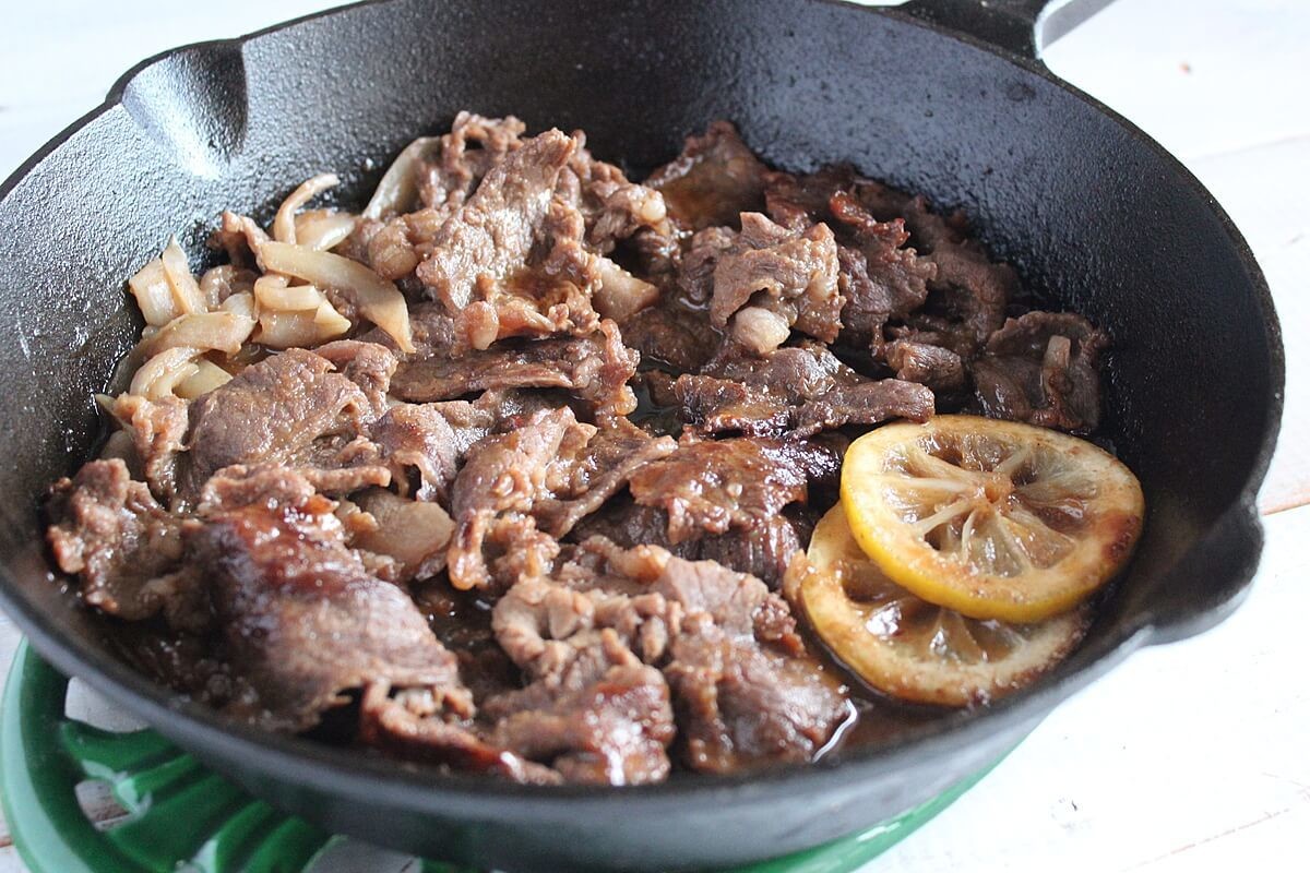 薄めにスライスされたステーキを焼き、最後にたれをかけていただくもののようです。