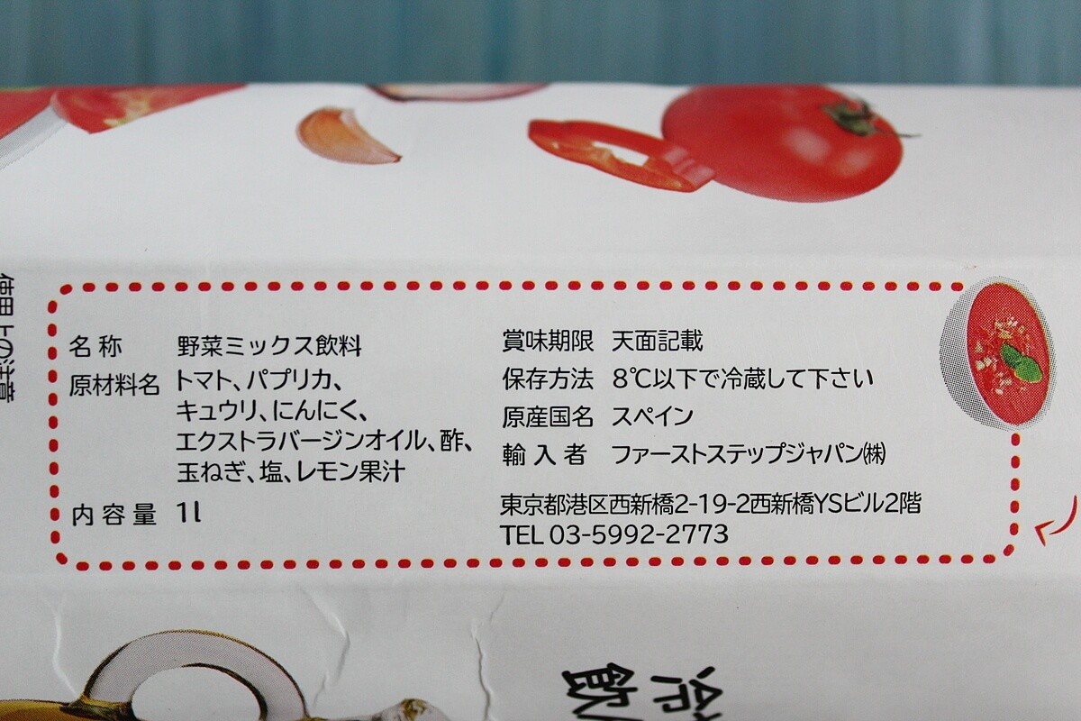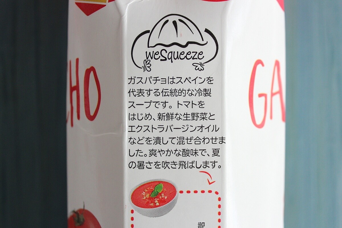 原材料に使われているのは、“トマト、 パプリカ、キュウリ、ニンニク、エクストラバージンオイル、 酢、玉ねぎ、塩、レモン”のみで、余計なものが一切入っていないのはとても嬉しいですね!安心してゴクゴク飲めます。