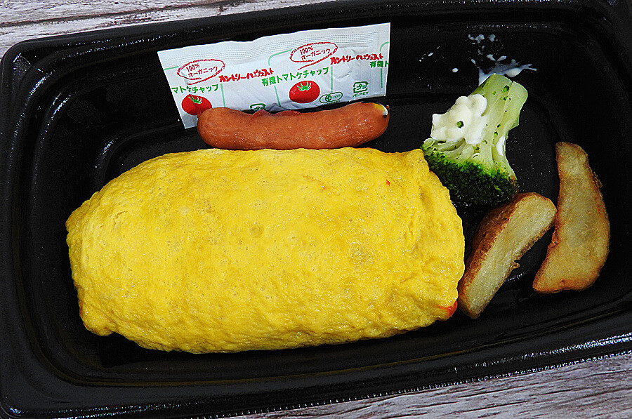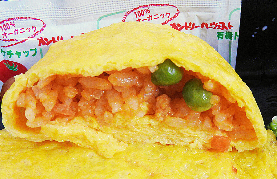 オムライスの中はチキンライス……鶏肉の存在感はほぼありませんでしたが、グリンピースやにんじんが入っていました。味はごく一般的なケチャップライスで、可もなく不可もなし。少なくとも、我が家の2歳から味についてのクレームはありませんでした。