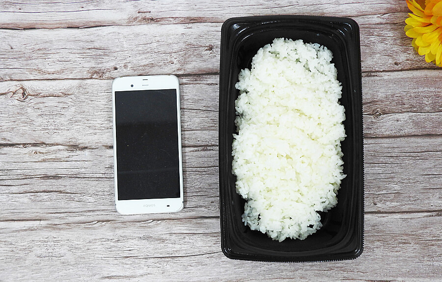 手持ちのスマホ・AQUOS SERIE SHV34 au(73×149×7.6mm)と比べると、ごはんの量がいかに多いかお分かりいただけると思います。1人では食べきれず、半分くらいは夫に食べてもらいました。