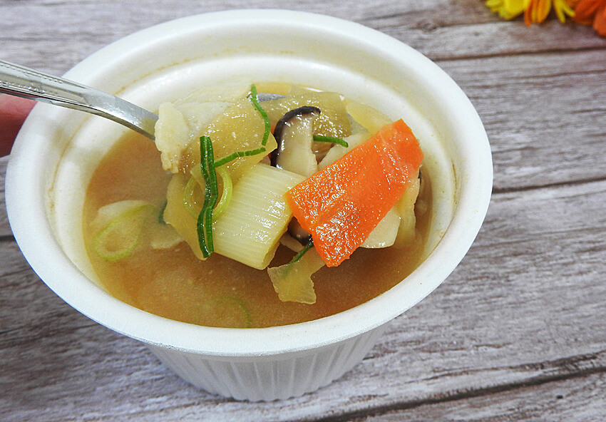 みそ汁の味は、ごく一般的かと思いますが、やや薄めかな?お弁当との相性はかなり良いですね。箸休めにはぴったり。胃が心配……という人は、とん汁はおすすめですよ。