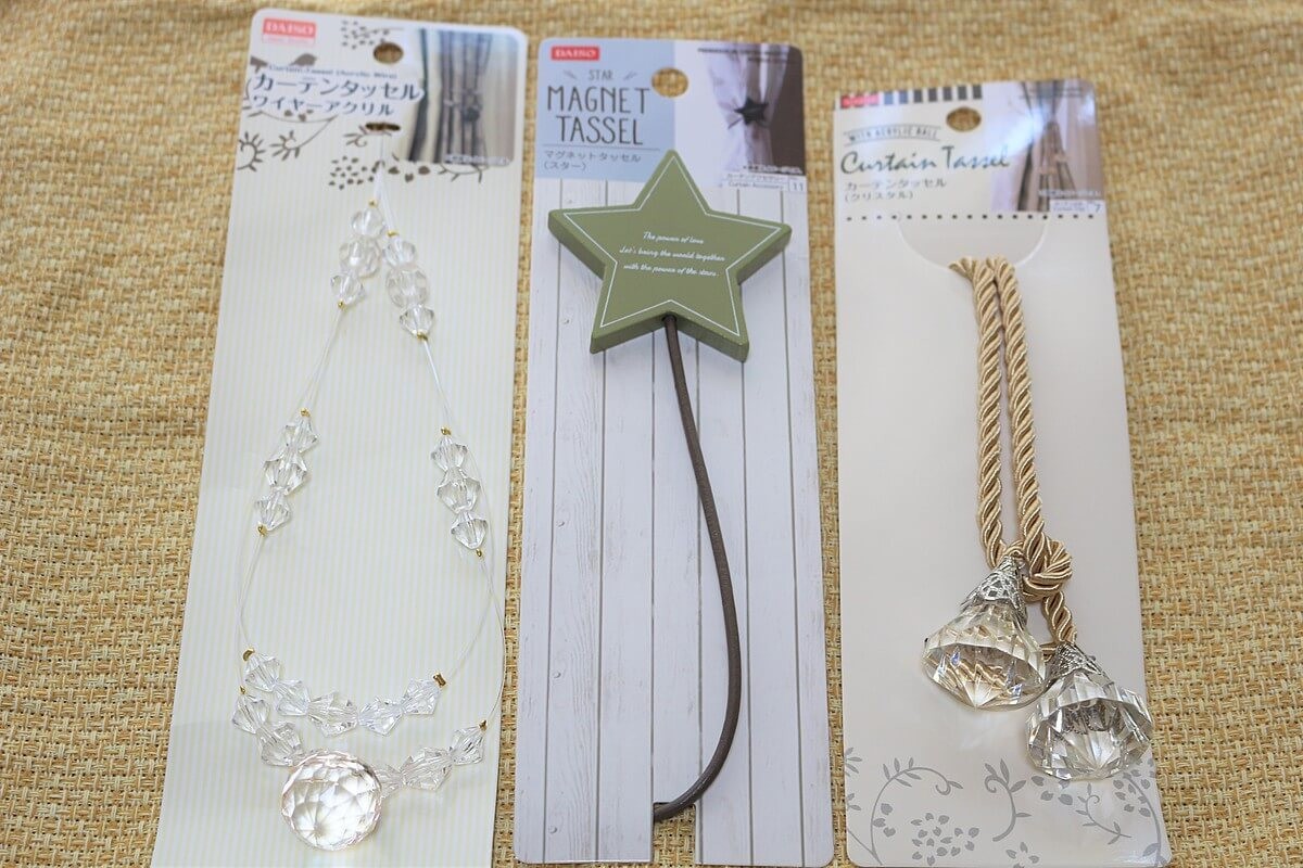 まずはカーテン専門店やニトリで探しがちなカーテンのタッセル。実は、ダイソーでも1本100円で買えるんですよ!