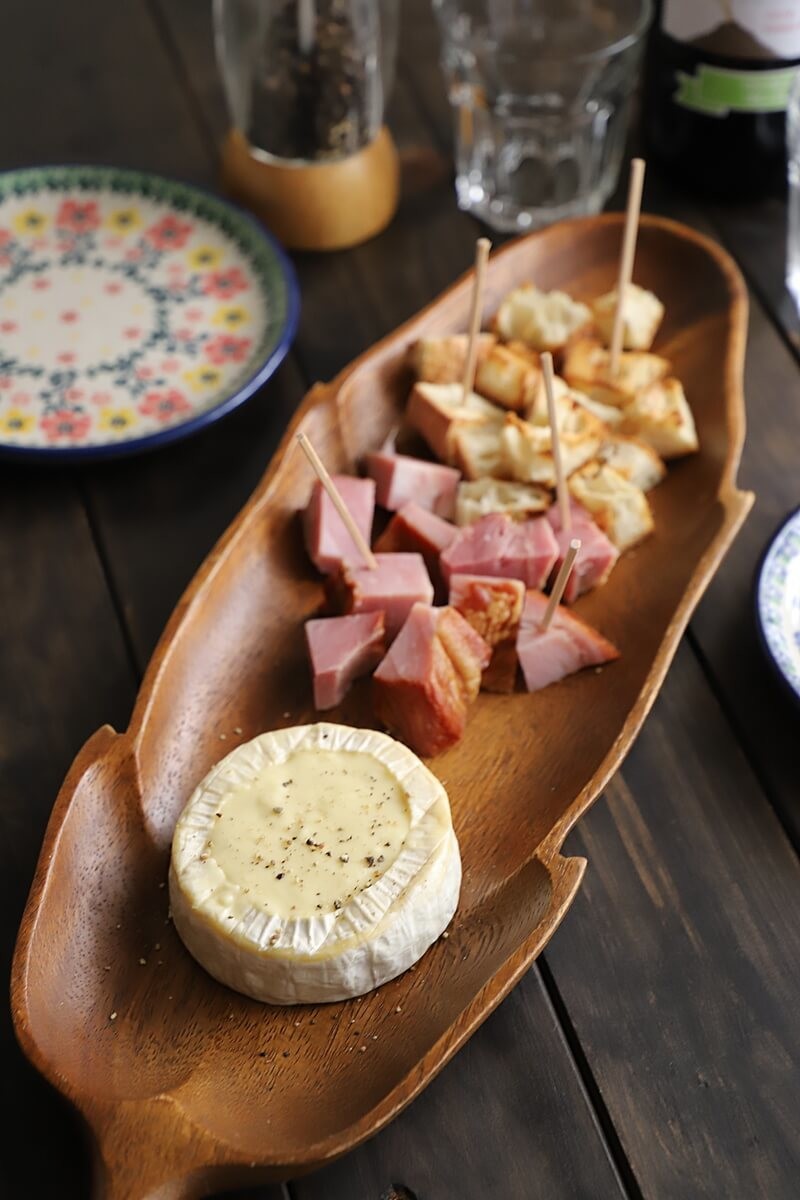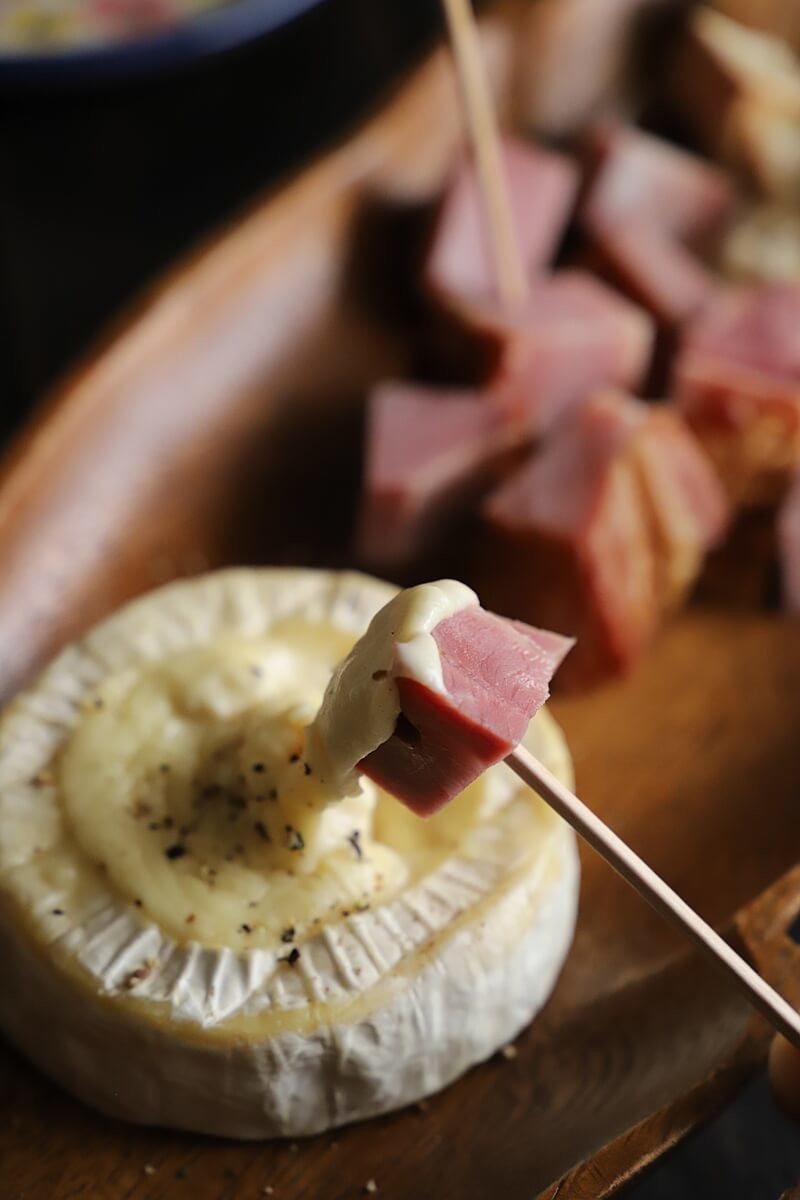 一口大に四角く切ったハムを簡単にできるチーズフォンデュ風にしていただいてみました。