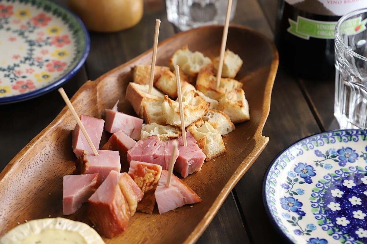 3cm角くらいにカットしたハムと、バゲットを用意します。今回ハムはそのまま用意しましたが、電子レンジで加熱後、軽く焼くと、より一層美味しくなると思いますよ♪