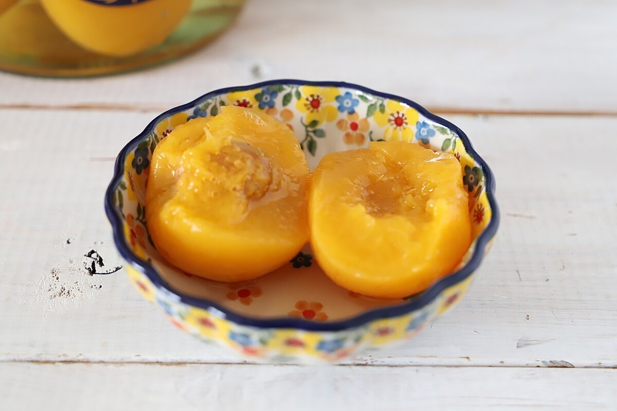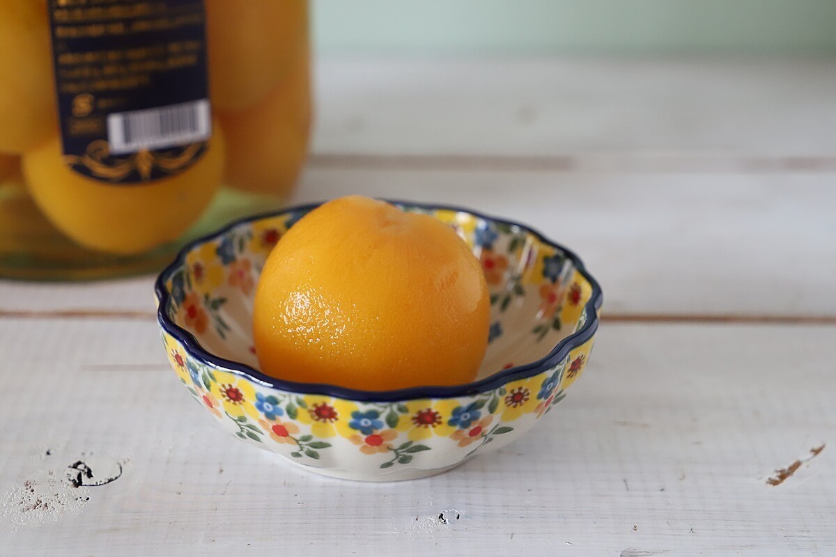 ピーチ1個は種をとり、7~8ミリ角ほどにカットし、オリーブオイルとバターで炒め、白ワインか酒を足し、醤油少々で味付けしています。
