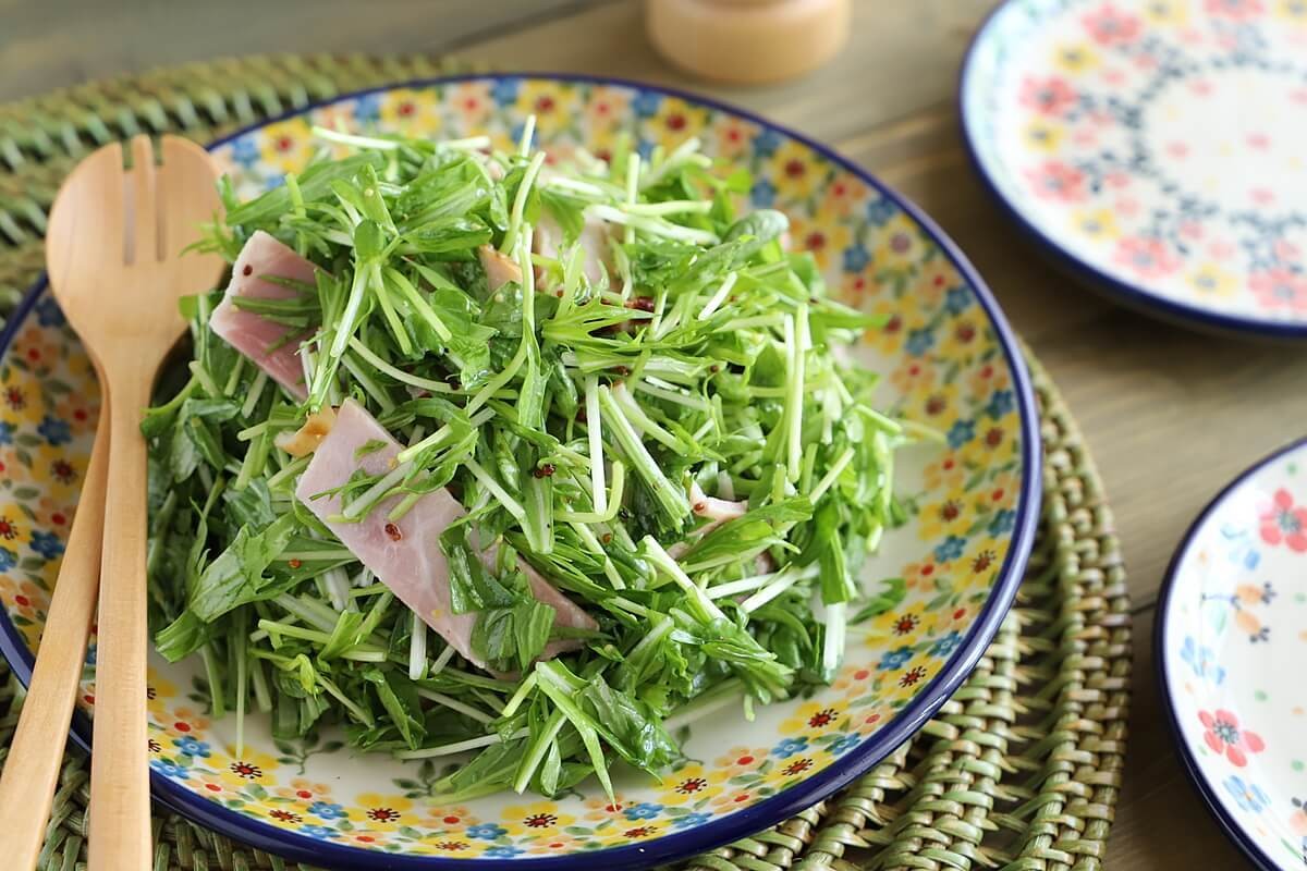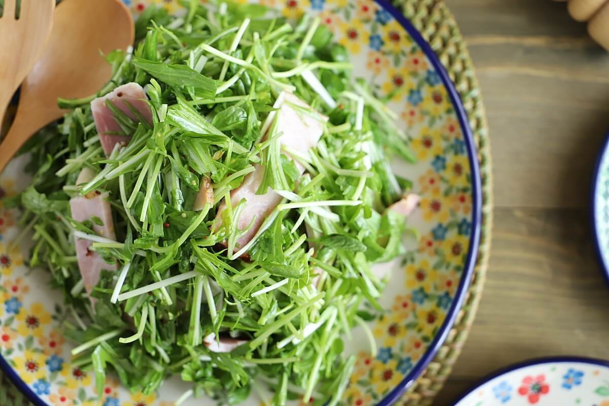 水菜2束、豆苗1袋を3cm幅に切り、大きくスライスしたハム1枚~1.5枚分を3cm幅くらいにカットしてボウルに入れ、