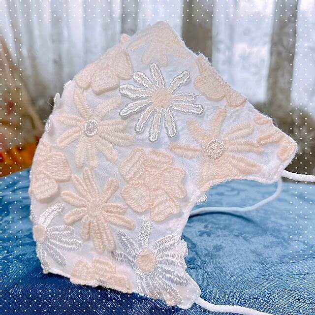 こちらは、花柄刺繍コットンレース生地で作られたマスクカバーです。立体的な刺繍が可愛いくて、使うのがもったいない~♡