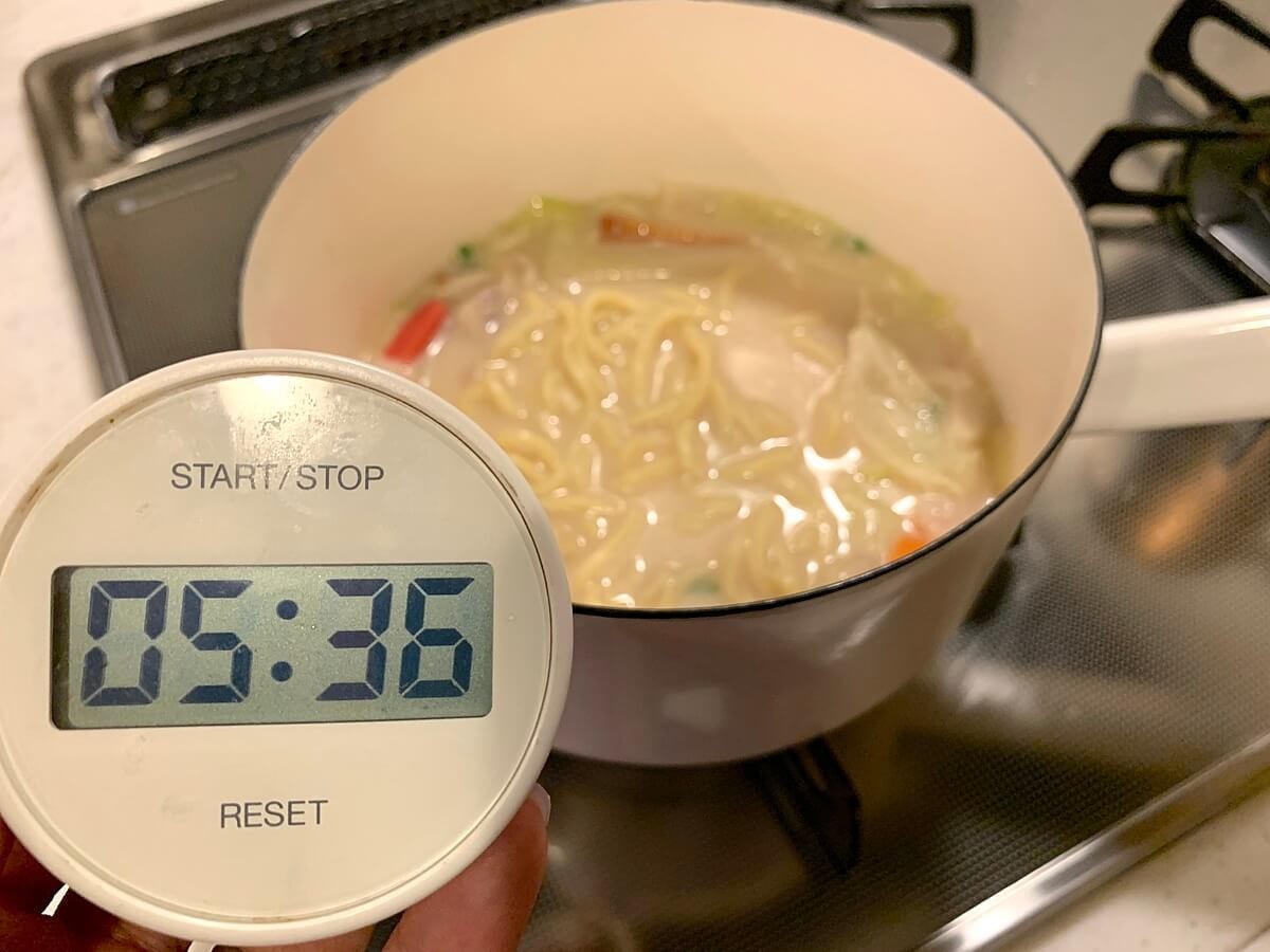 水を測って入れるところから煮込み終わるまでの時間を測ってみたところ、5分36秒。