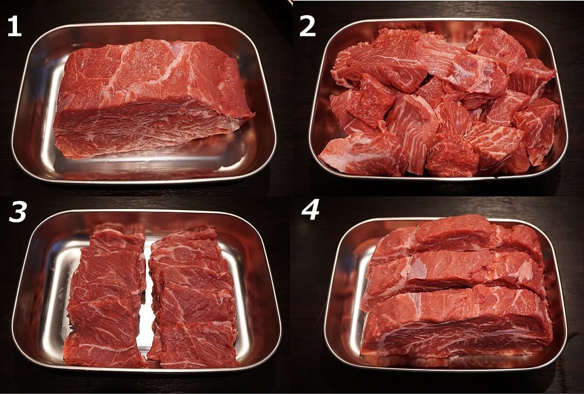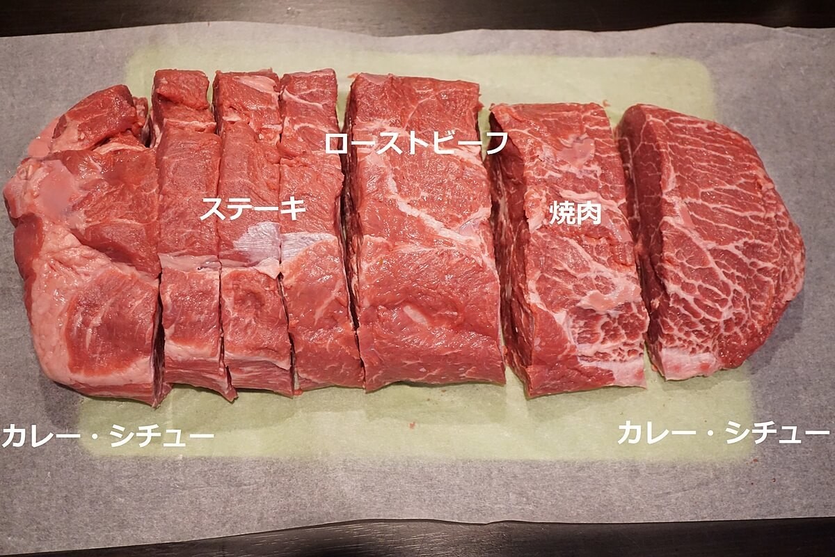 我が家は大体ローストビーフ・ステーキ・カレーやシチュー・焼肉用にカットします。