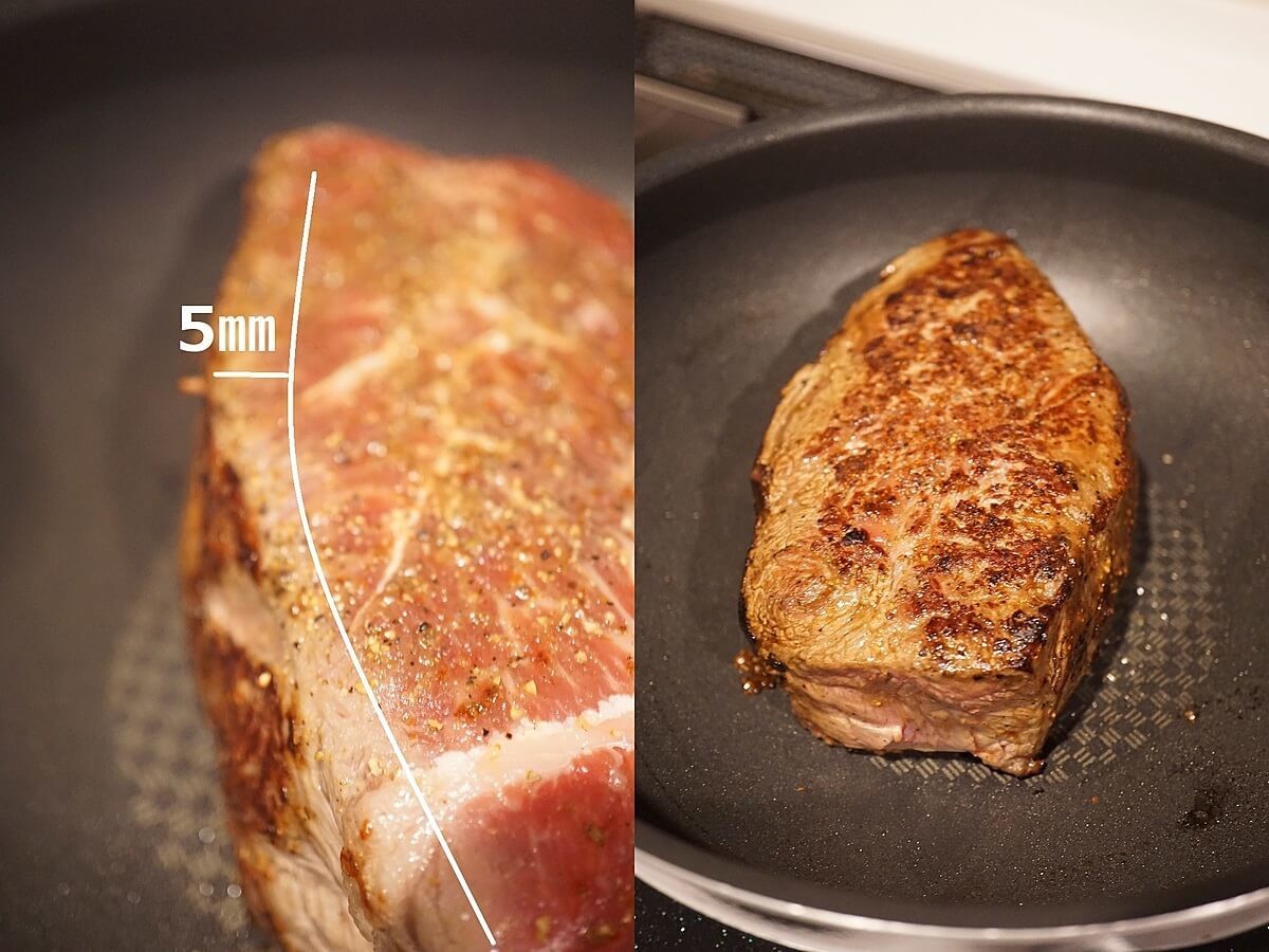 ・お肉の1面を焼く目安は、お肉の表面から中へ5mm程度の焼き色がつくぐらいです。(写真左)