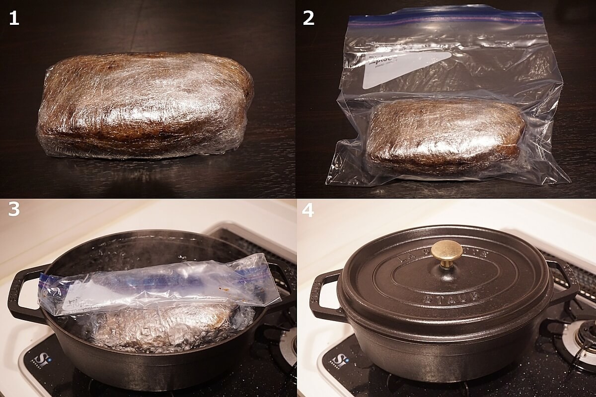 1.粗熱がとれたらお肉をラップでしっかり包みます。(2~3重に包むのがおすすめです)