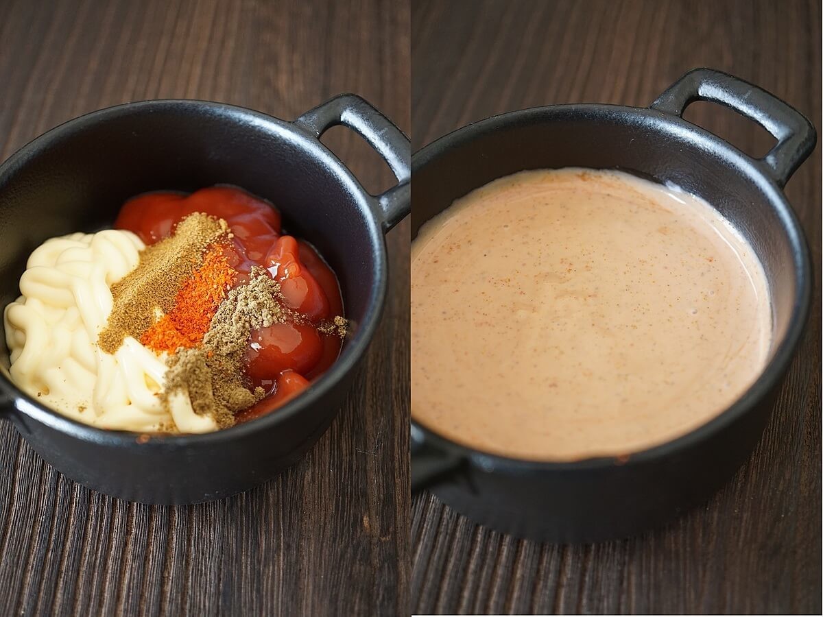 ・◆の調味料(マヨネーズ・ケチャップ・ガラムマサラ・カレー粉・チリペッパー)を混ぜてソースを作ります。