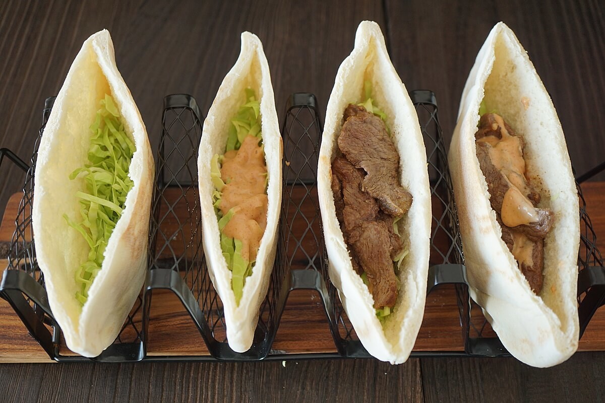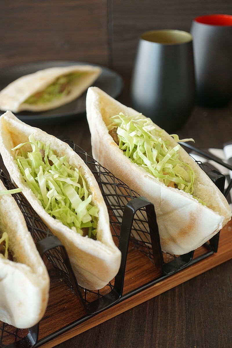 ・キャベツ・ソース・ミスジ・ソース・キャベツの順でピタポケットパンに具材をつめて出来上がり。