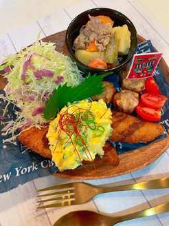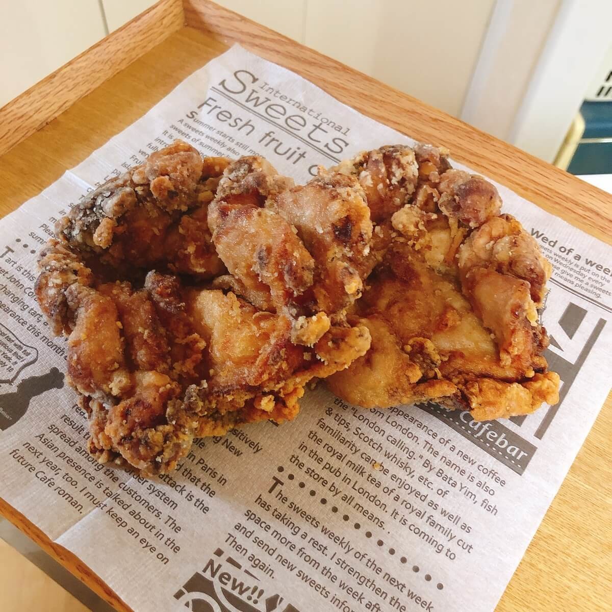 鶏もも肉を1枚まるまる揚げたもので、しっかりとした味つけで衣はパリッとしています。鶏もも肉1枚で作った唐揚げという感じです。とくに、育ち盛りの男の子たちには、たまらない揚げ物といえそうです。