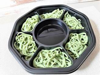 真ん中につゆが入った容器に鮮やかな麺が目を引く「割子茶めん」。 割子は本来丸い器を重ねて小分けにした麺を入れるものですが、小さな区切りでつゆが囲んであるので割子のように楽しめます。