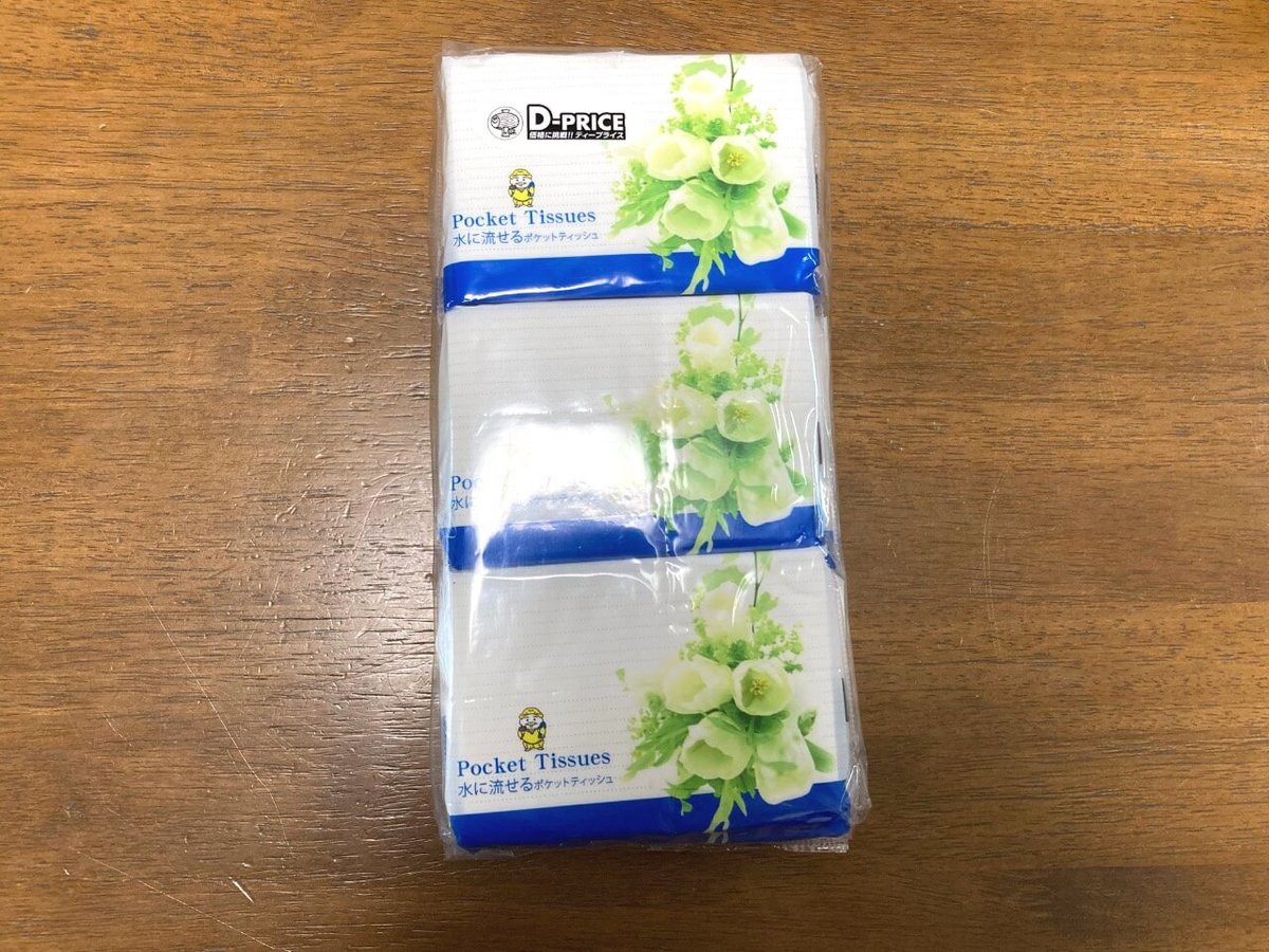 ラ・ムーの「水に流せるポケットティッシュ」は12個入りで80円、しかも水に流してOKという親切設計♪