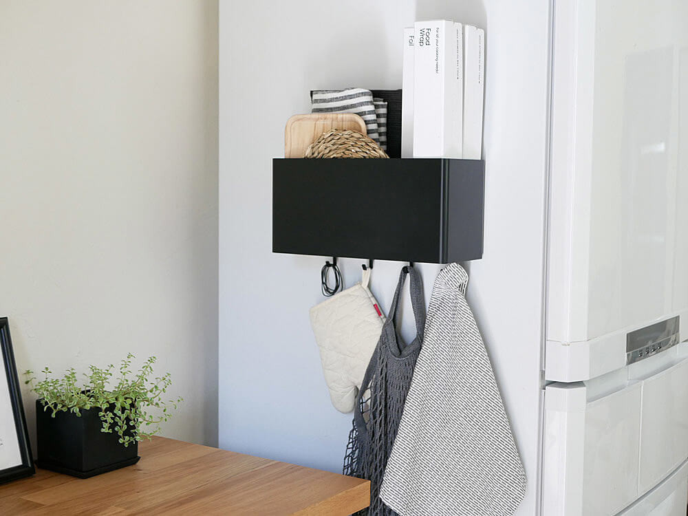 冷蔵庫横にサランラップ、鍋敷き、トレイ、レシピ本など定番物をしっかり入れられます。 さらに、付属のフックを付ければ、布巾、ミトン、輪ゴム等も掛けられとっても便利。