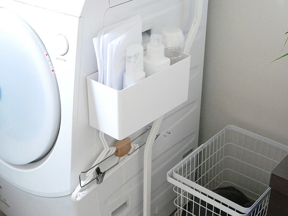 この大容量サイズなら、洗剤、柔軟剤、洗濯ネット……フックにハンガーを掛ければ、家事が時短かつスッキリ収納に。