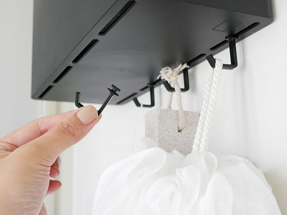 シャンプーボトルやボディーソープも入るサイズ感で、フックも取り付ければ小物類も掛けられます。