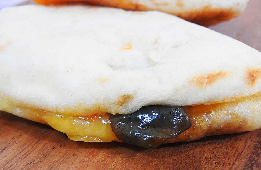 三日月型に折りたたまれており、パン生地同士はくっついています。中身を確認しようとしましたが、パンがくっついていてパカッと開けられませんでした。