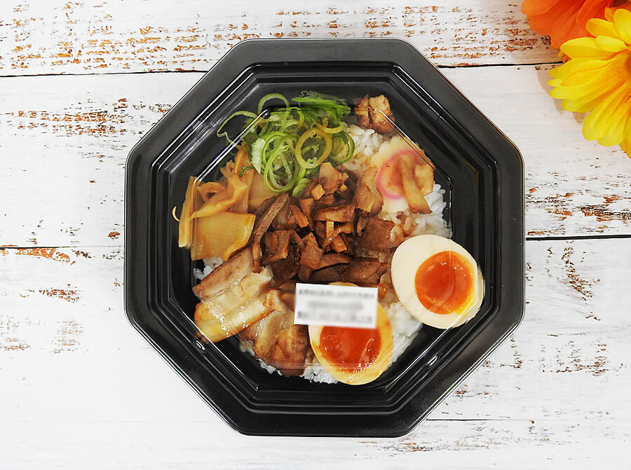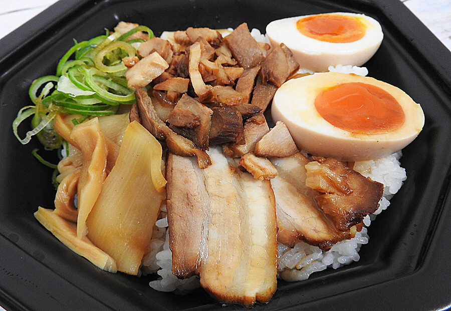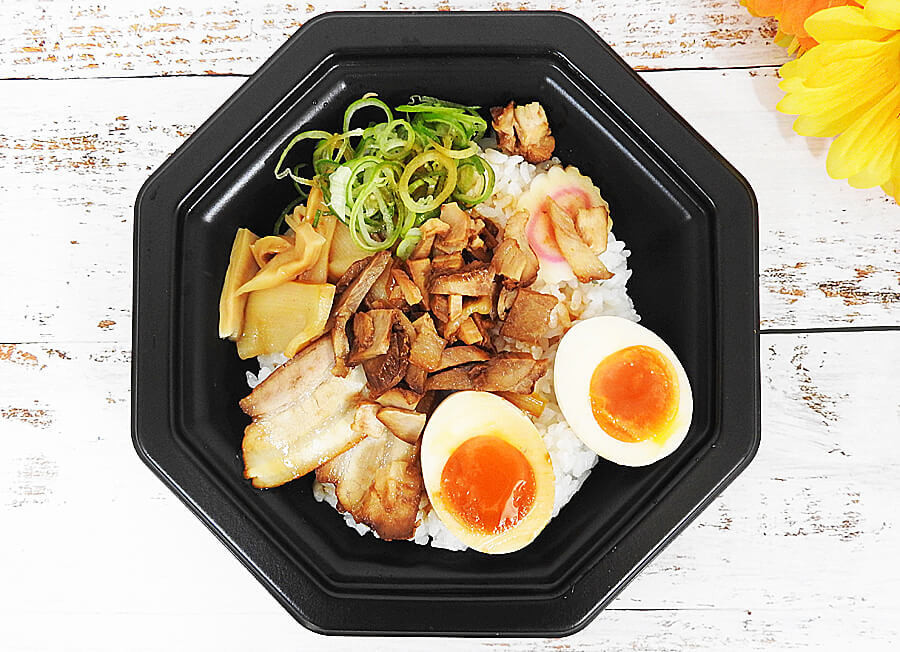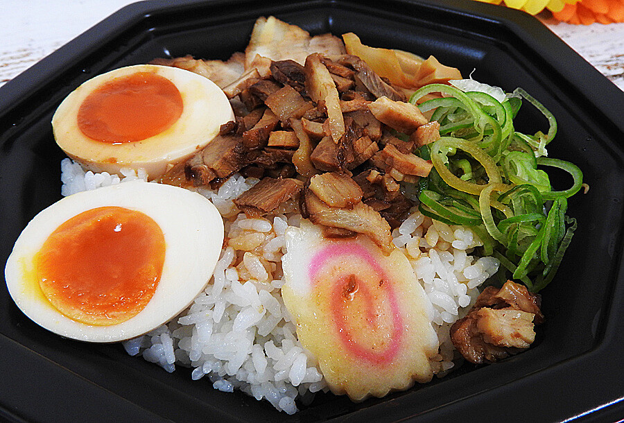 チャーシュー・たまご・ねぎ・メンマ・なるとといったラーメンの具材としてお馴染みの食材がご飯の上にトッピングされていました。