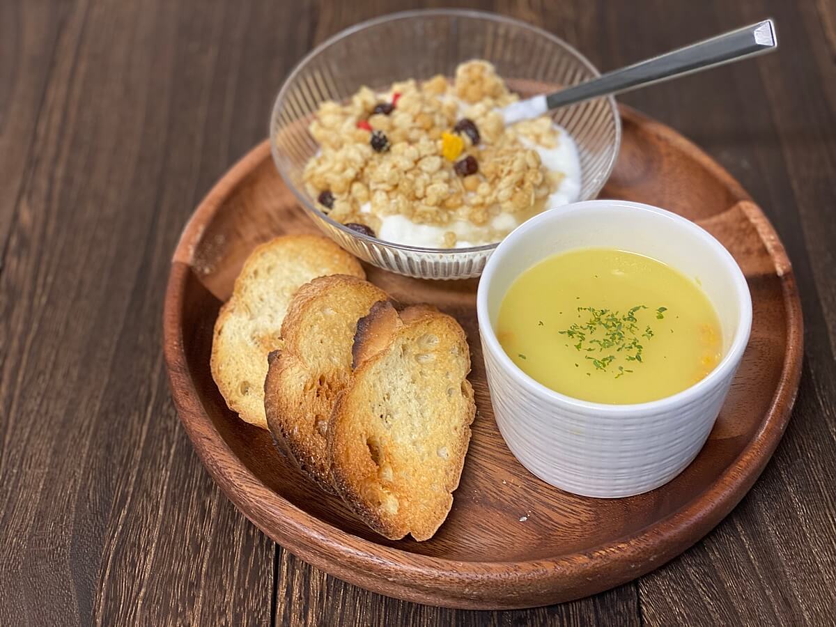 あると何かと便利なのが、インスタントのコーンスープ。1人おうちご飯にヘビロテしています。コーンスープがあるだけで「ちゃんとしたご飯」に変わるし、見た目がカフェ風ご飯になってテンションも上がります。おかげで「ランチ外食」が激減しましたよ!