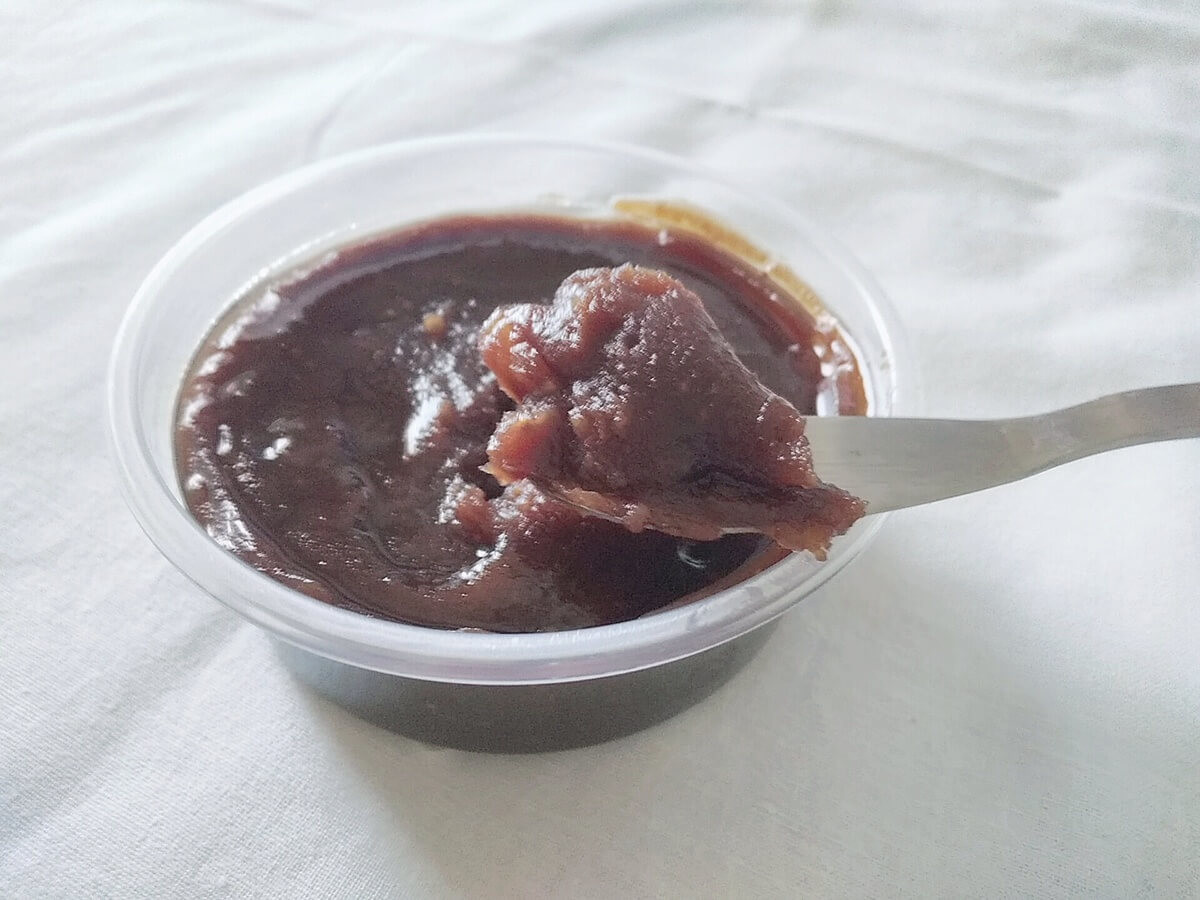 容器の中には“こしあん”がずっしり。これだけだとただの“こしあん”ですが、ユニークなのが、あんの中にナッツやドライフルーツが混ぜ込まれていること。