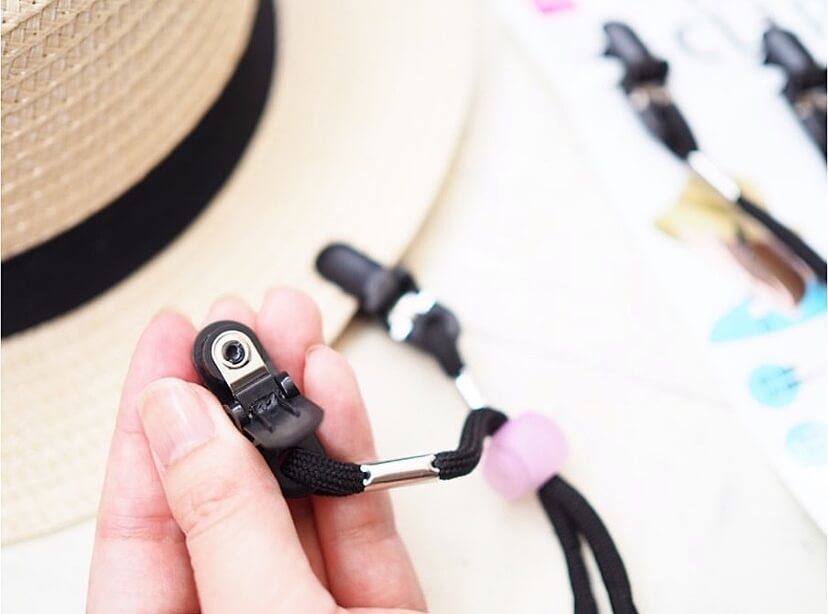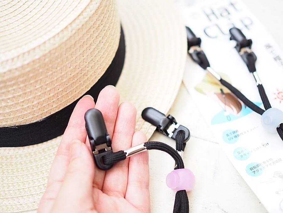 帽子の左右に付けることで、風で帽子が飛ばされるのを防ぐことができるんです♪