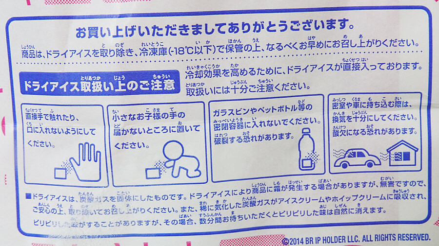サーティワンでは、持ち帰り時にドライアイスをつけることができます。暑い日では持ち運んでいる間に、アイスが溶けてしまう可能性が高いため、ドライアイスは必須。