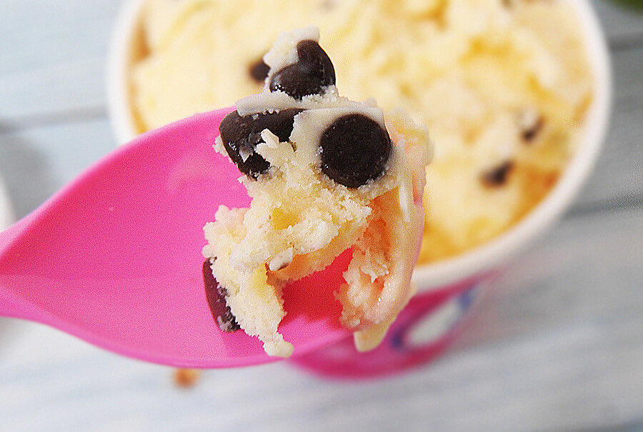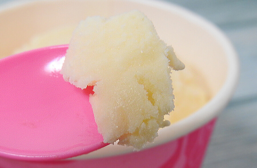 冷凍庫の状態によっては取り出した直後はカチカチに凍っていることもありますので、数分待ってから食べた方がいいかもしれません。ちなみに、我が家の冷凍庫から取り出した直後は、スプーンがまったく突き刺さらない位に凍っていました。