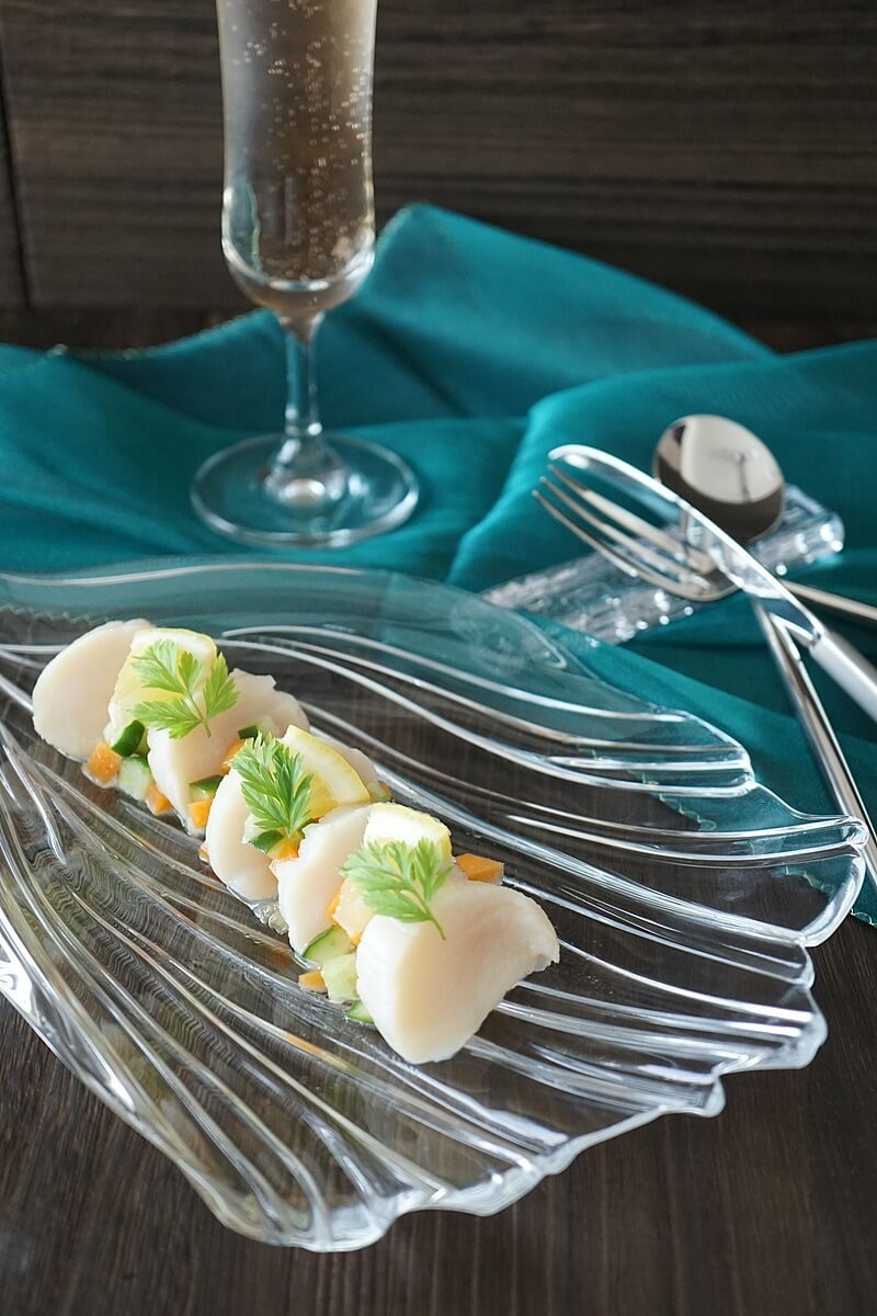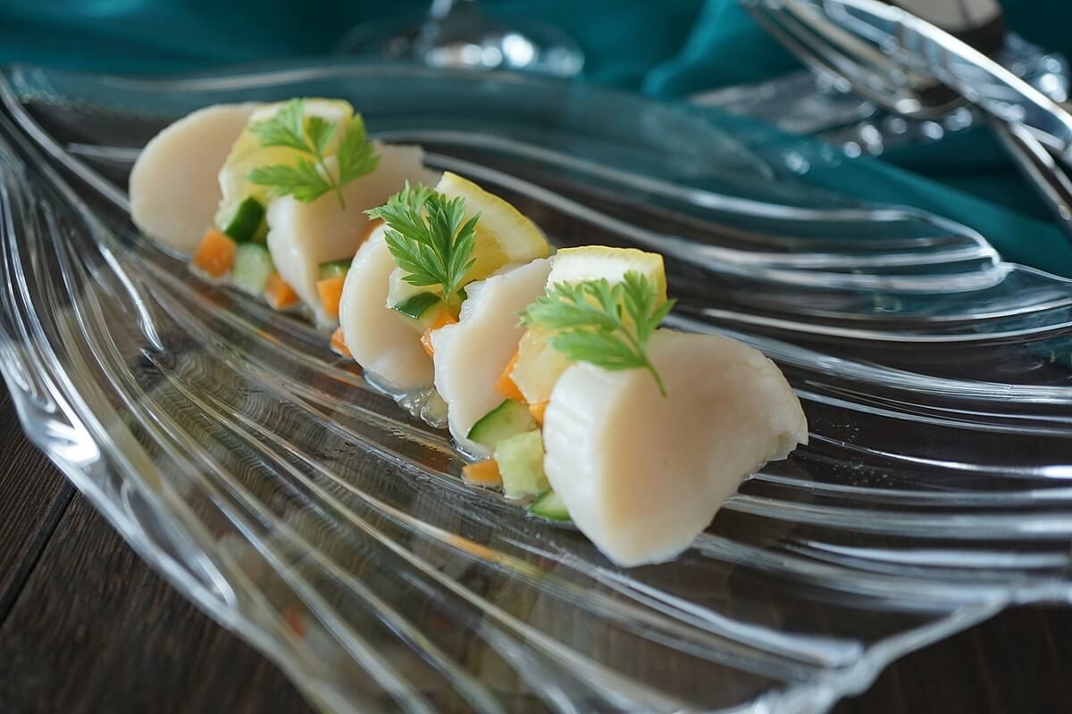 刺身用のホタテに少し火を通し、レアの状態のホタテに細かくカットした野菜を添えています。