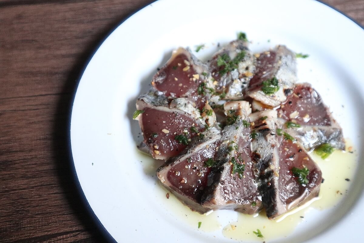 切ったお刺身に(写真はかつおのたたき)、レモンペッパーをガリガリとふりかけて、オリーブオイル(あればパセリ)を散らせば、「簡単カルパッチョ」の完成です!
