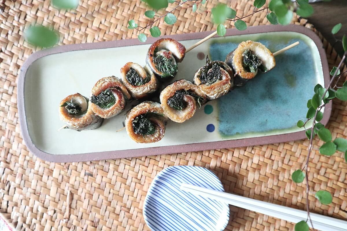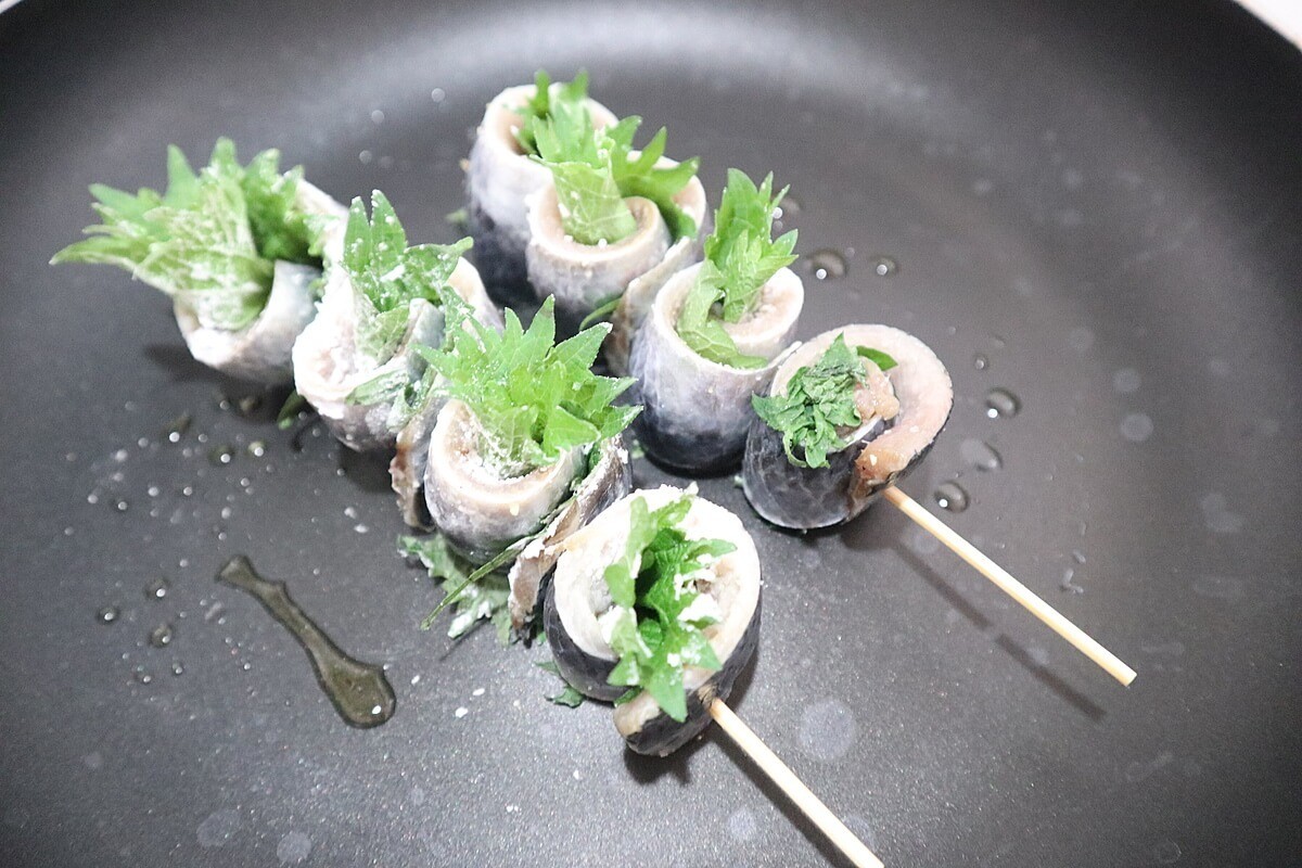 1.鰯の内側にガーリックソルトをふり、茶こしで両面に小麦粉をふる。内側に青じそをのせて尾の方から巻いて串にさす。