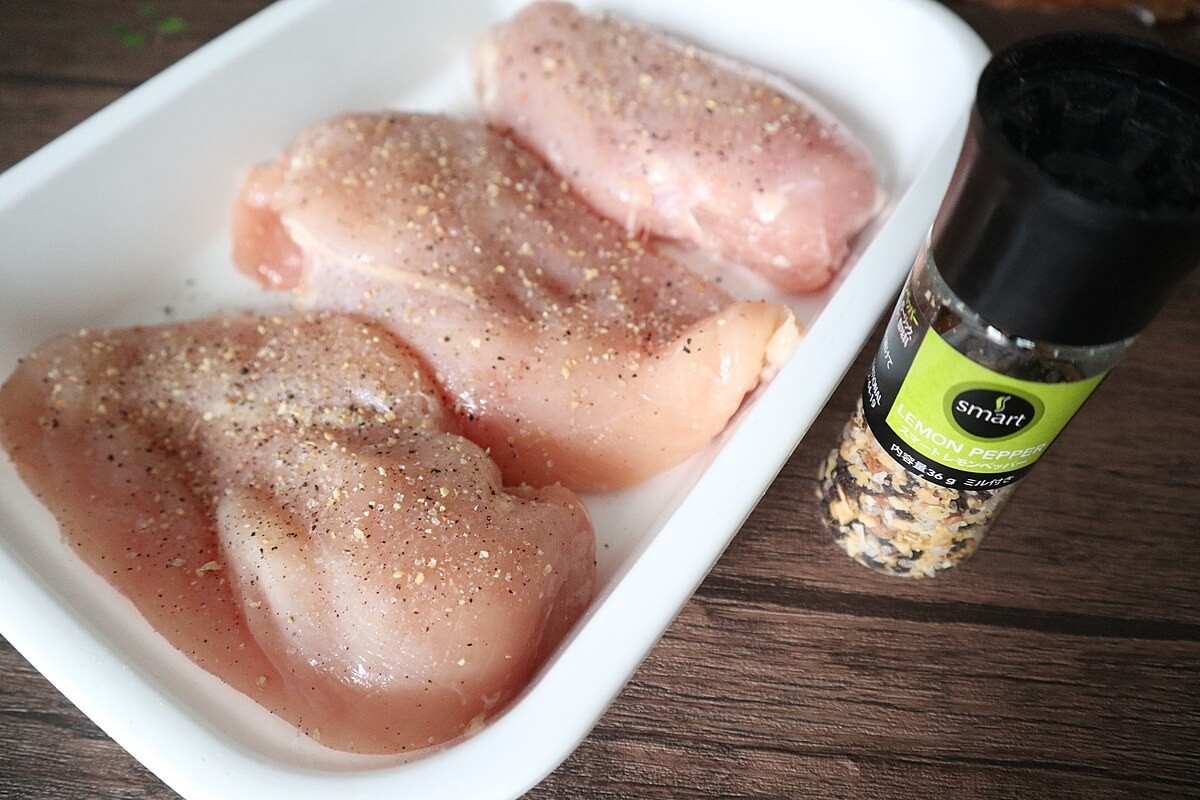 かなりしっかりめに鶏むね肉(皮を取り除く)の両面に、「レモンペッパーをガリガリするだけ」で、ともすれば淡白になりがちな鶏むね肉の旨味が濃厚になります。