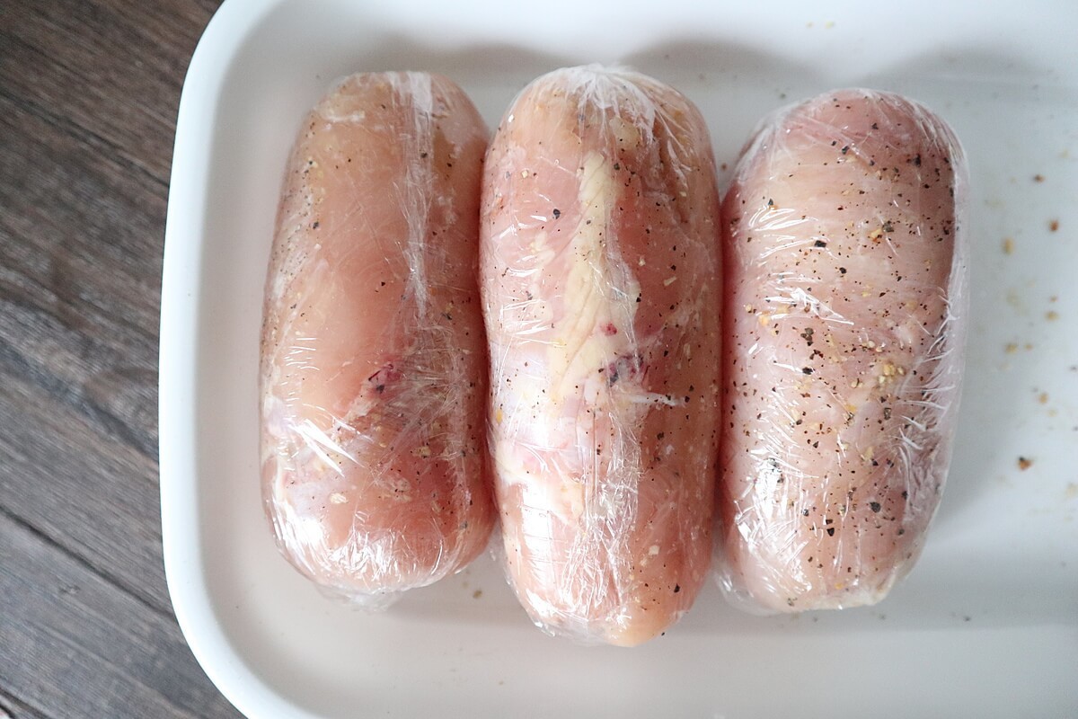 鶏むね肉を側面からくるくる巻いてラップで包んで5時間ほど冷蔵庫で寝かせます。 大きめの鍋にラップに巻いた鶏肉と水を入れて中火にかけます。 沸騰したらゆで、5~7分経ったら火を止めて、湯の中で冷めるまで置いたら完成です。